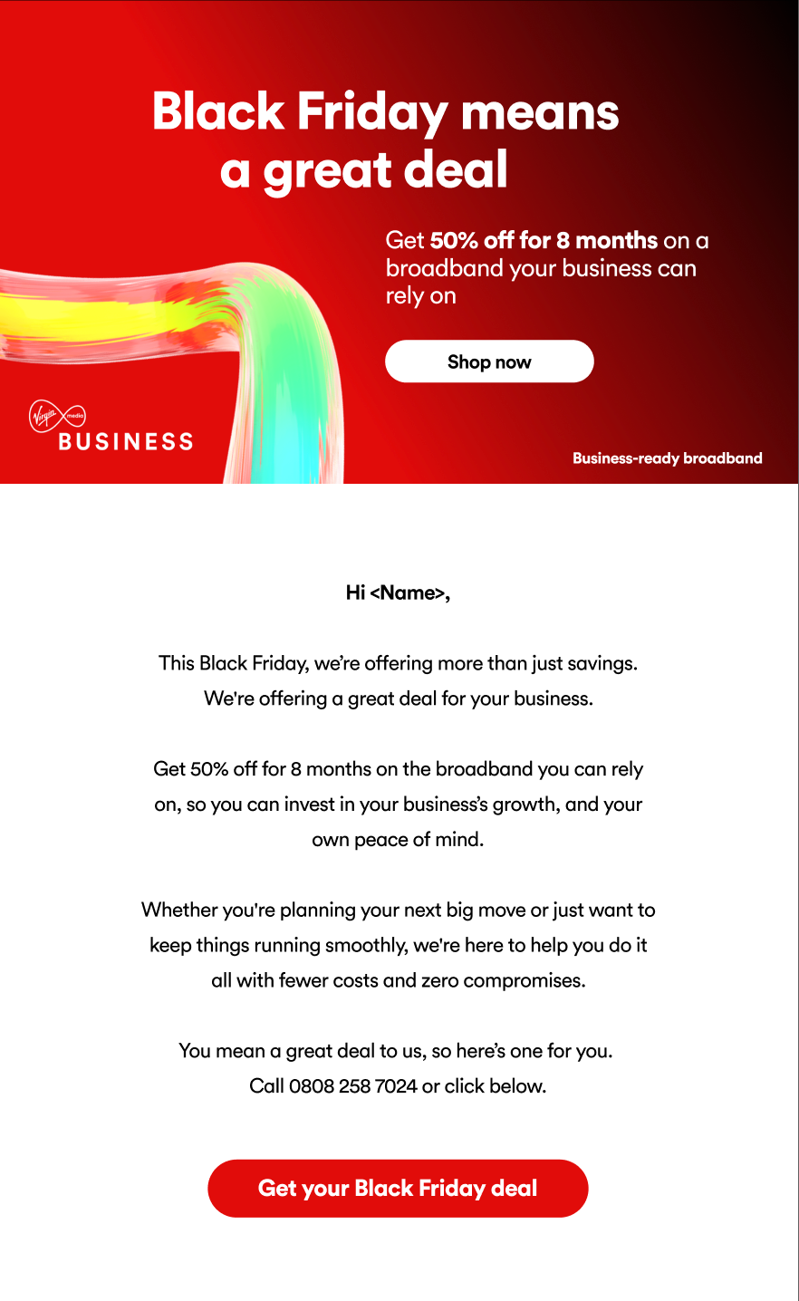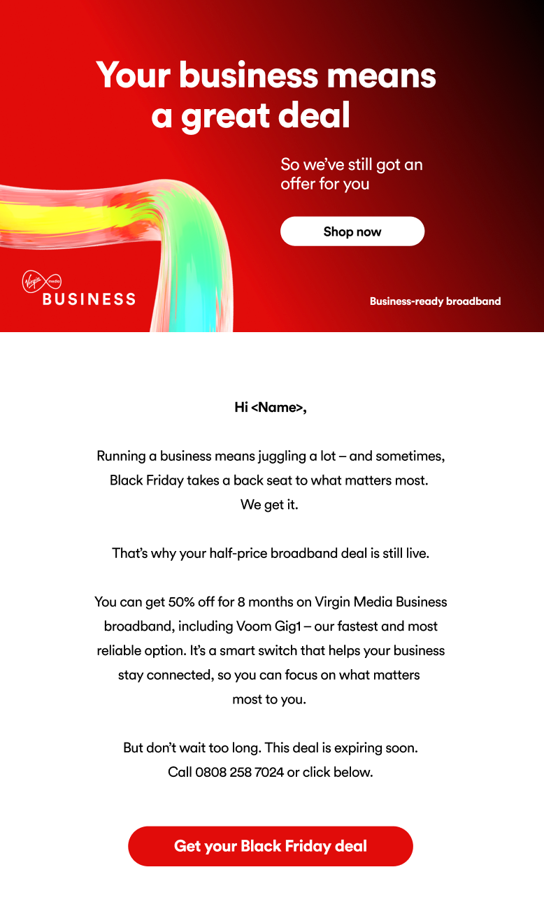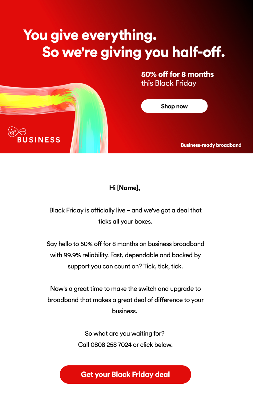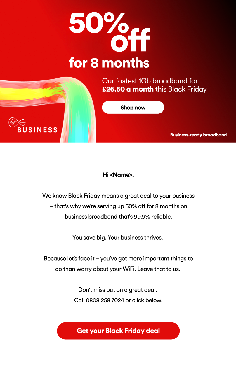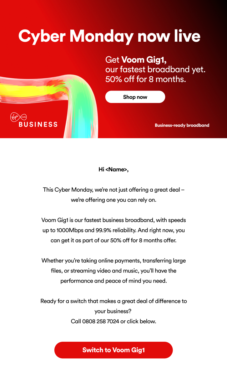 Solution: That’s where Virgin Media Business comes in. We’re not just offering a discount. We’re giving you a deal that truly makes a difference. With 8 months half price on a 99.9% reliable network, you’re not just saving money. You’re investing in a foundation for future success. This offer helps your team work smarter, improves efficiency, and sets your business up for growth.